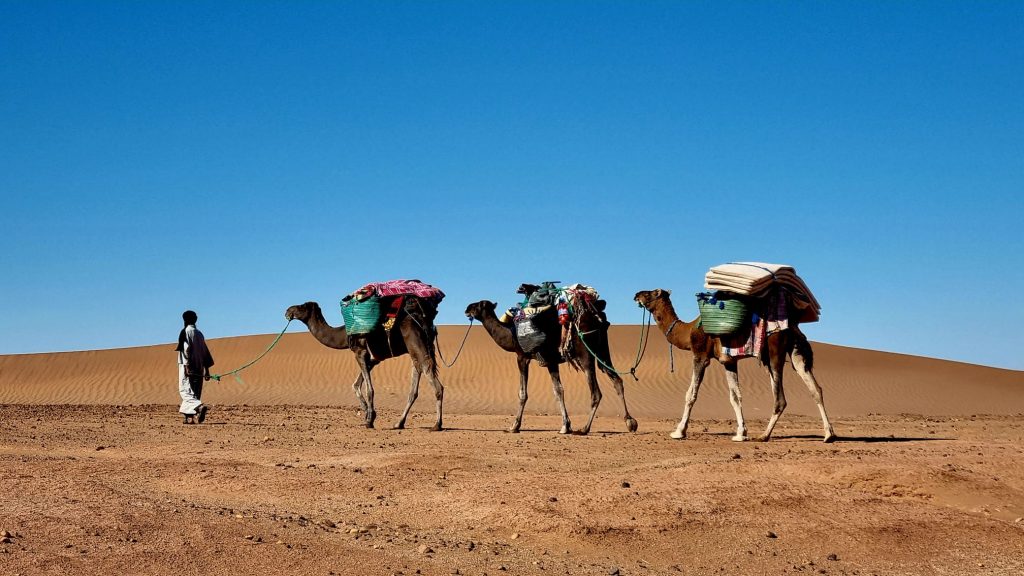 Le petit déjeuner est servi à la marocaine. Nous continuons ensuite notre découverte des paysages désertiques, avant de nous arrêter pour déjeuner et prendre une tasse de thé à la menthe. Après le déjeuner, la randonnée à dos de dromadaire continue vers les dunes de Mezouaria. C’est ici que nous passons la nuit, soit sous la tente, soit en plein air sous le ciel étoilé.